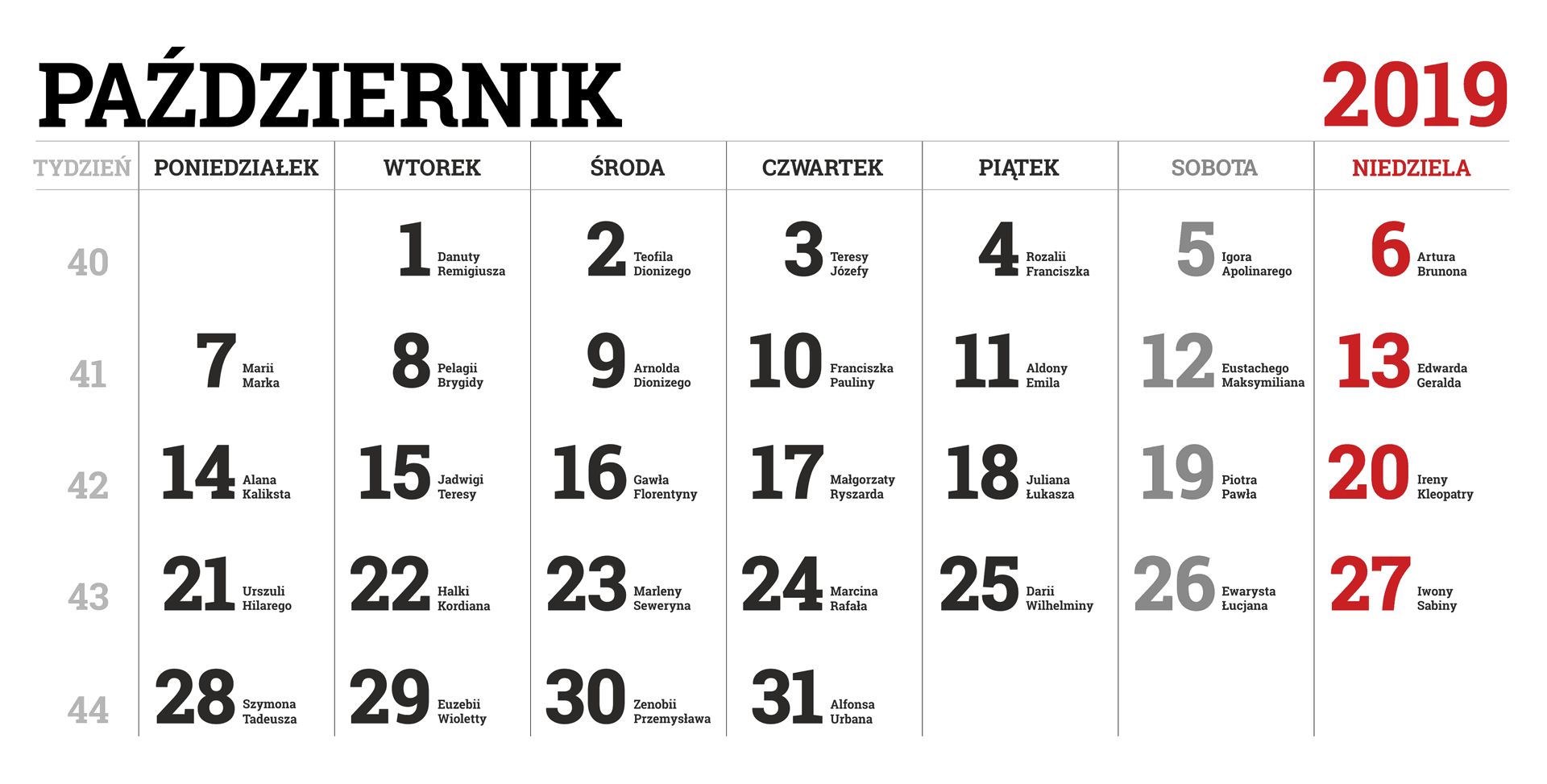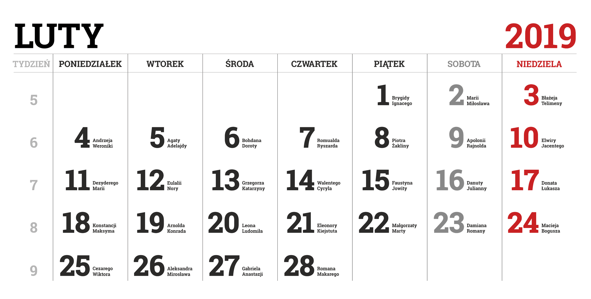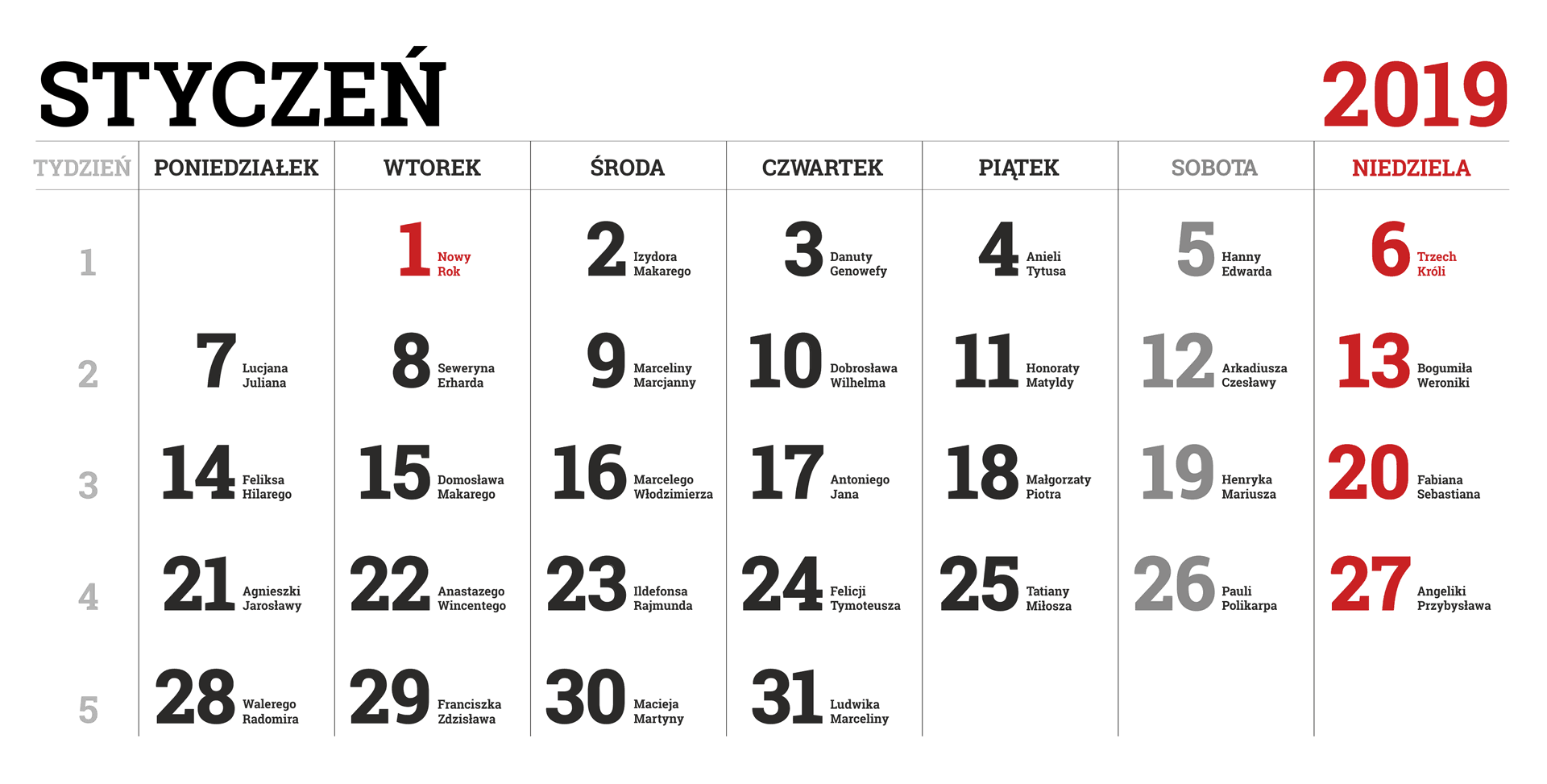 Kalendarz na 2019 rok – w obrazkach PNG – miesiąc po miesiącu – wraz z imieninami.