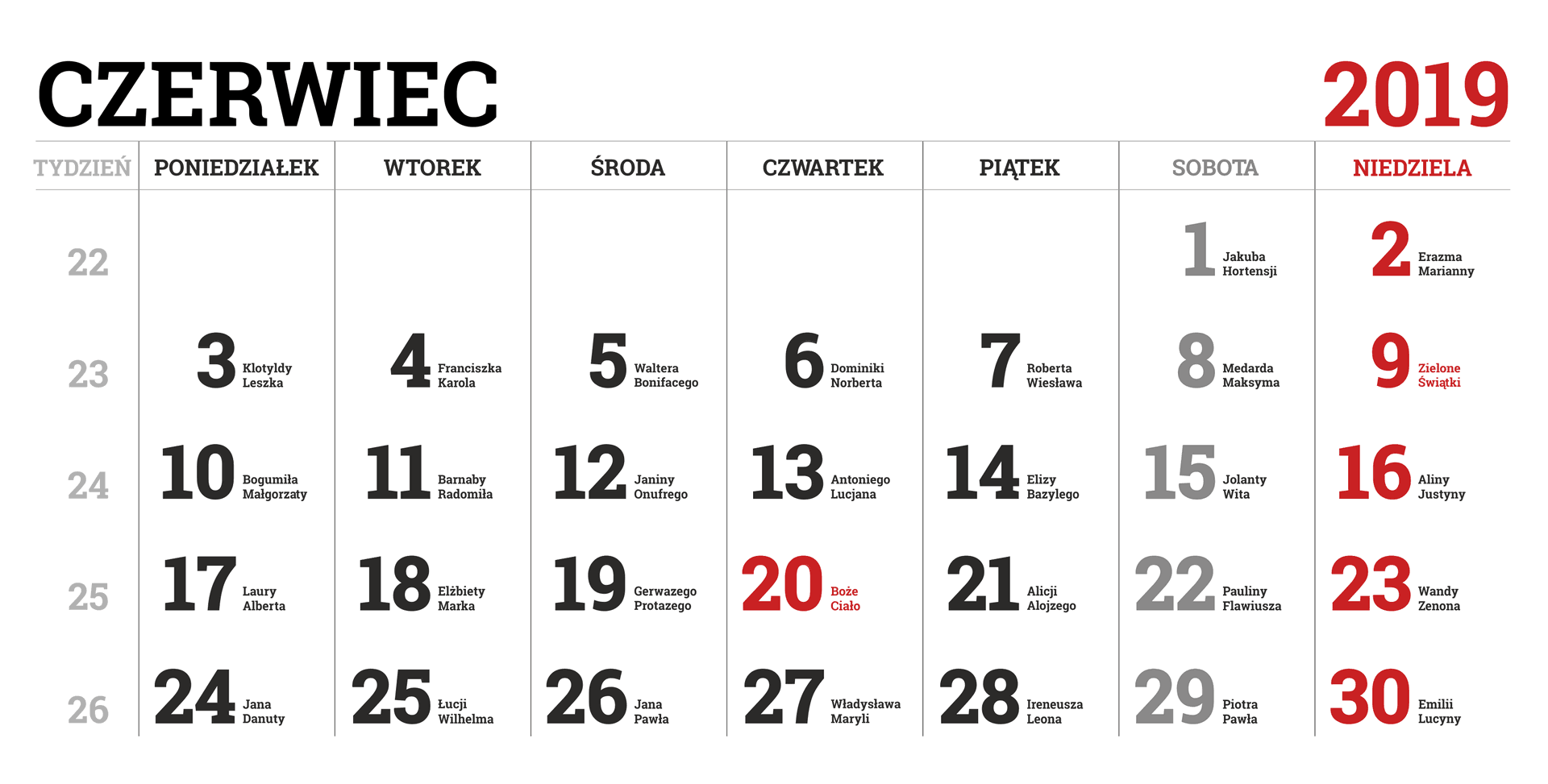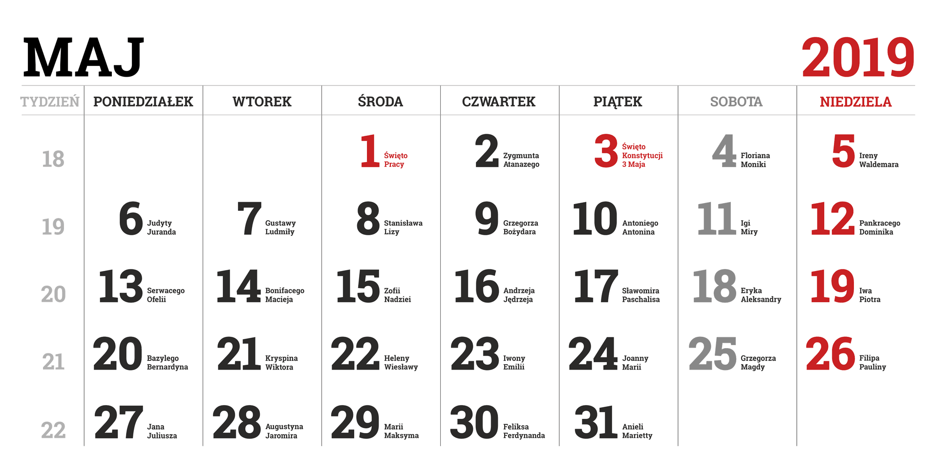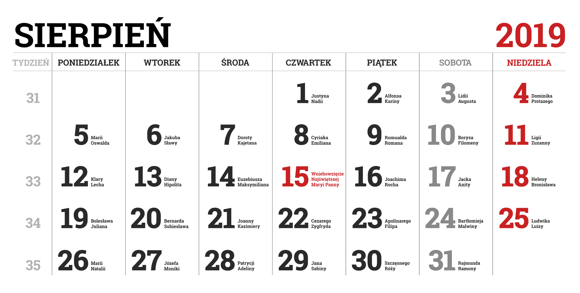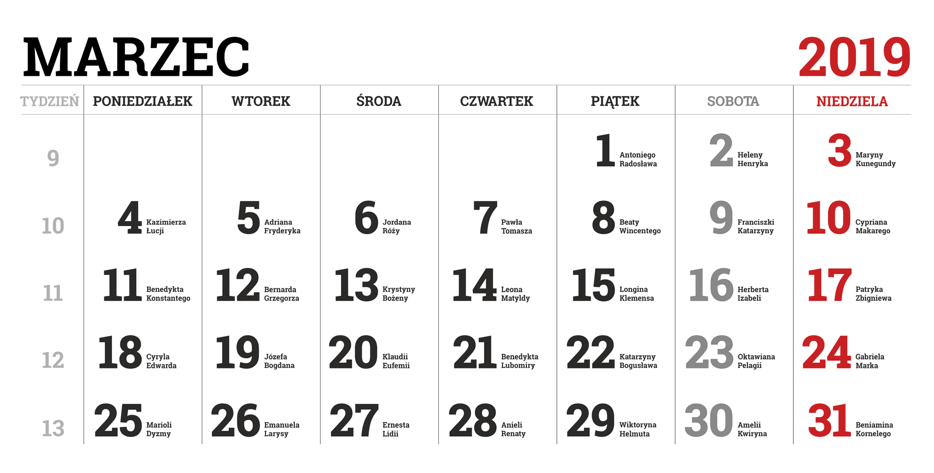 Kalendarz na 2019 rok – w obrazkach PNG – miesiąc po miesiącu – wraz z imieninami.